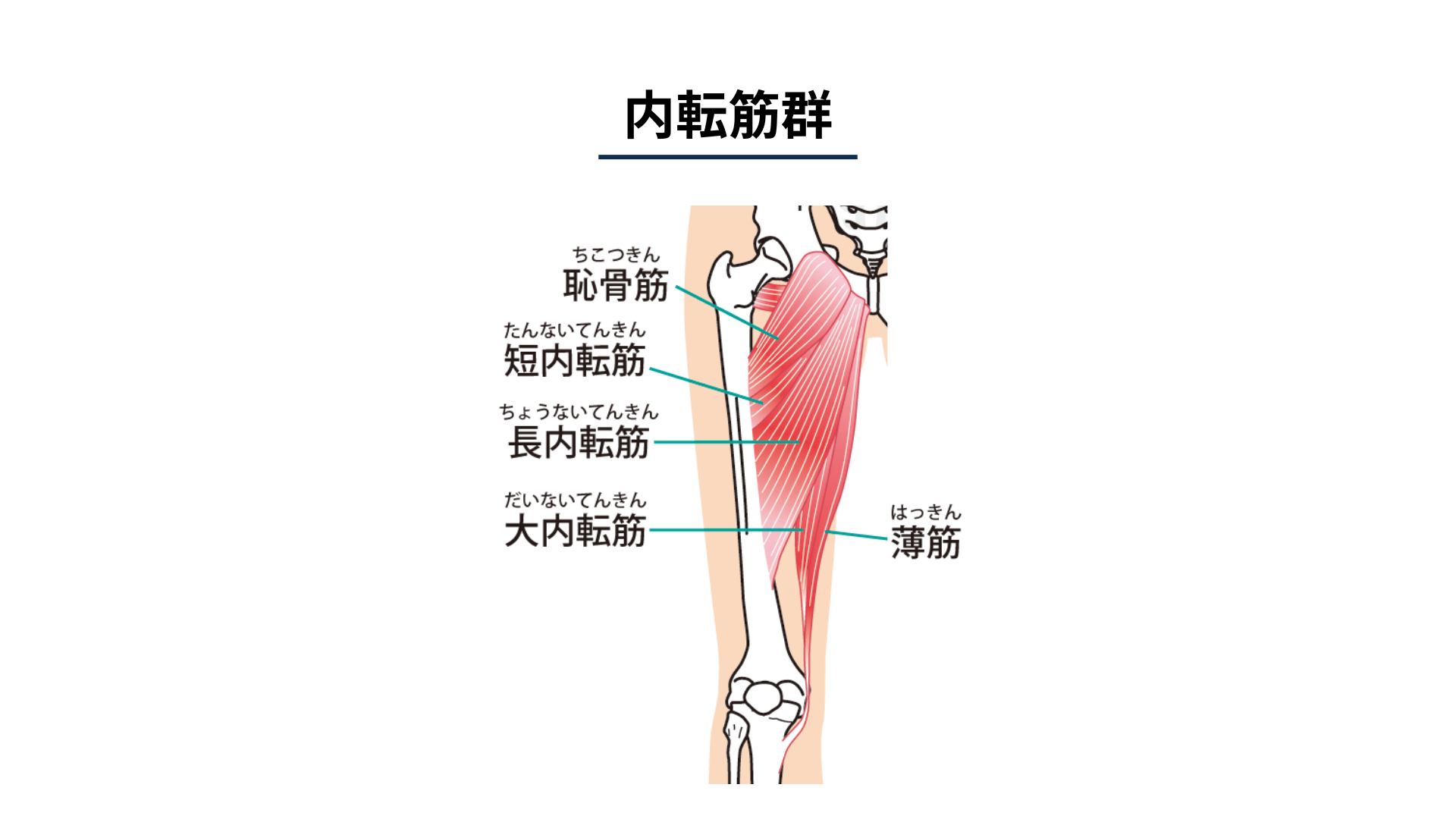 内転筋群は「恥骨筋、短内転筋、長内転筋、大内転筋、薄筋」の5つの筋によって構成されており、股関節の内転に作用する他、角度によっては屈曲や伸展にも関わります。