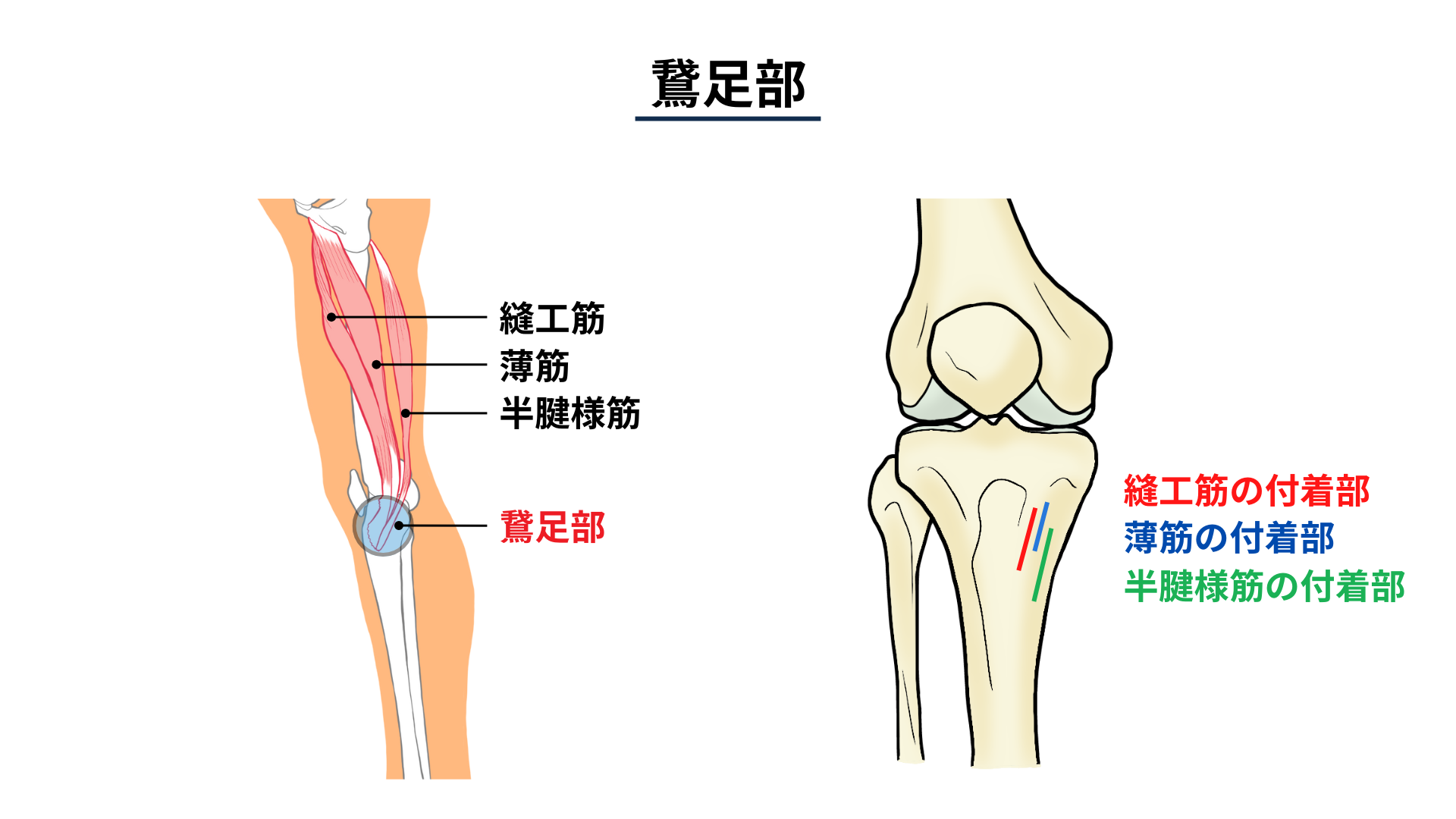 薄筋の停止部である脛骨粗面内側部には、縫工筋や半腱様筋も付着しており、鵞鳥(ガチョウ)の足のように見えることから”鵞足”と呼ばれています。