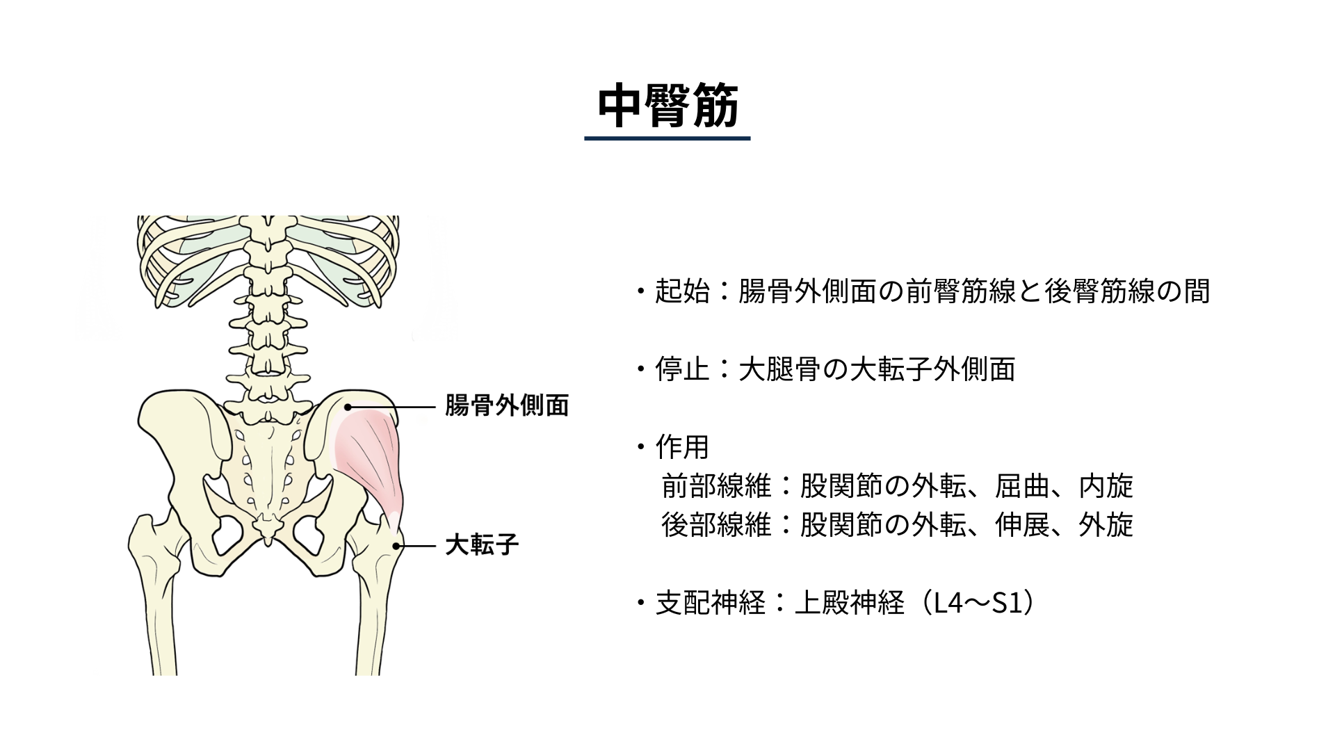 中殿筋は股関節の主要な外転筋であり、歩行時における骨盤の安定化に中心的な役割を果たします。