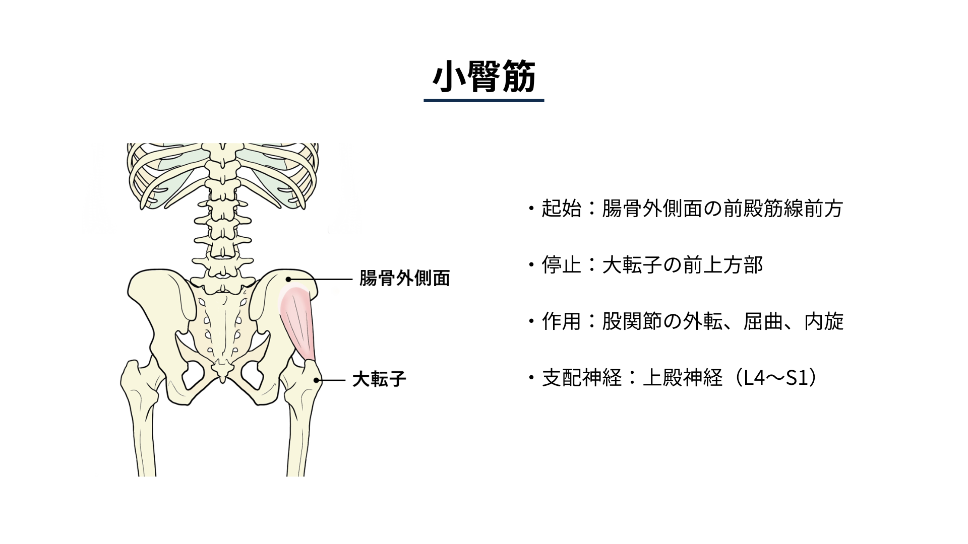 下肢の安定化に必要な筋ではありますが、膝関節を外旋方向へ牽引する作用も有するため、過緊張には注意が必要です。