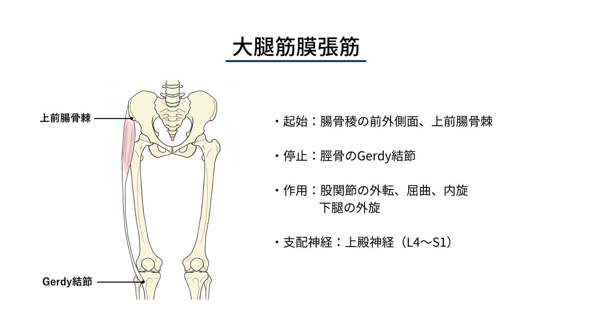 大腿筋膜張筋は股関節の屈曲・外転・内旋に作用し、腸脛靭帯と連続することで膝関節の安定性にも関与します。