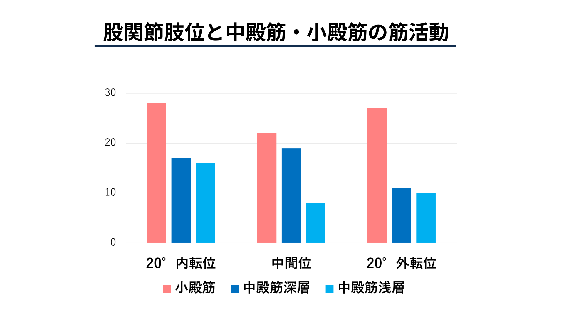 外転角度が20°を超えると中殿筋の活動が低下し始め、相対的に小殿筋の活動量が高まるという報告があります。